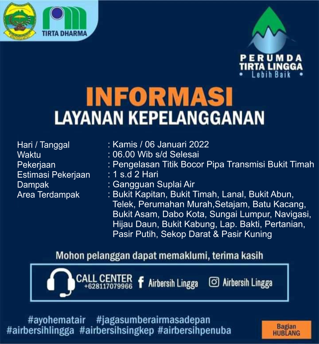 Info Pelanggan, Harap menjadi perhatian pelanggan Perumdam Tirta Lingga, Untuk Tanggal 06 Januari 2022