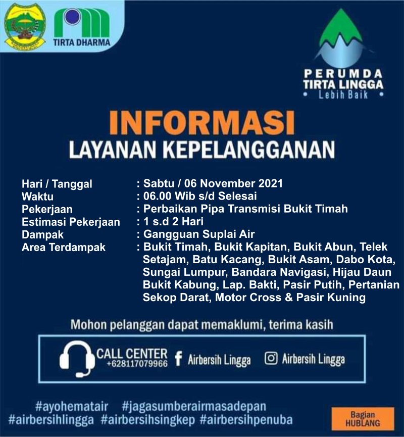 Info Pelanggan, harap menjadi perhatian perlanggan Perumdam Tirta Lingga, Untuk Tanggal 06 November 2021. Ada pekerjaan perbaikan pipa transmisi Bukit Timah.