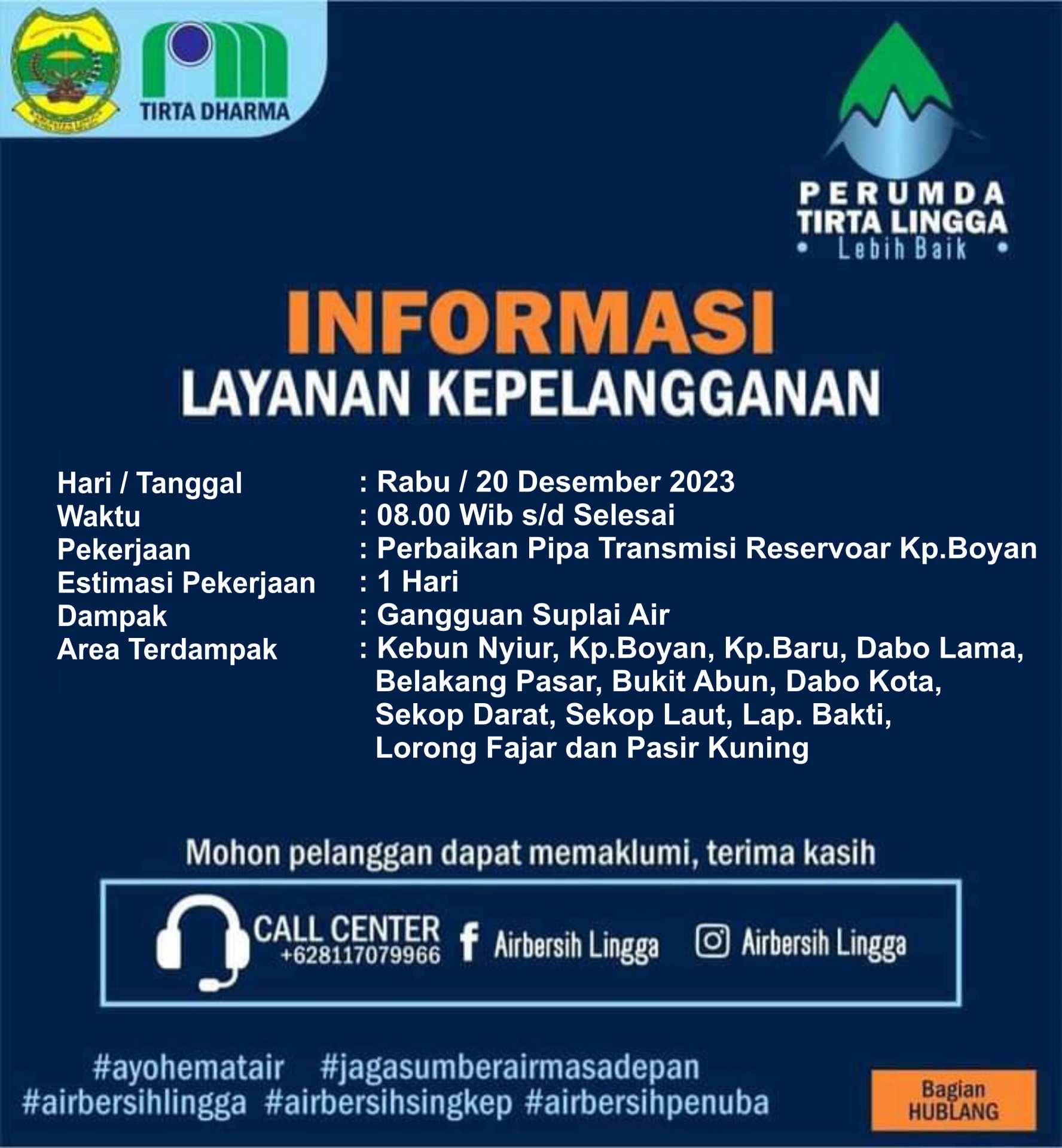 Pipa transmisi waduk Gemuruh milik Perumda Air Minum Tirta Lingga pecah sehingga menyebabkan air tidak tersalurkan ke rumah-rumah warga. Saat dikonfirmasi, Direktur Perumda Air Minum Tirta Lingga, Irfan Andaria mengatakan, saat ini tengah dalam proses perbaikan dan masih menunggu beberapa