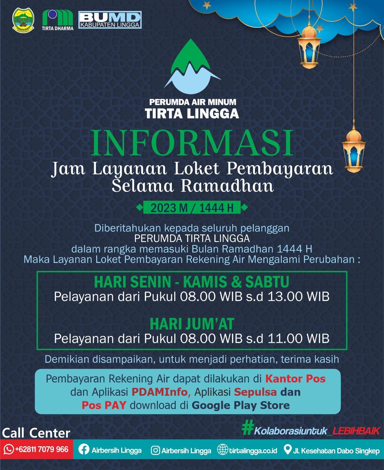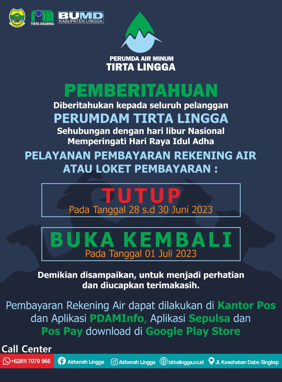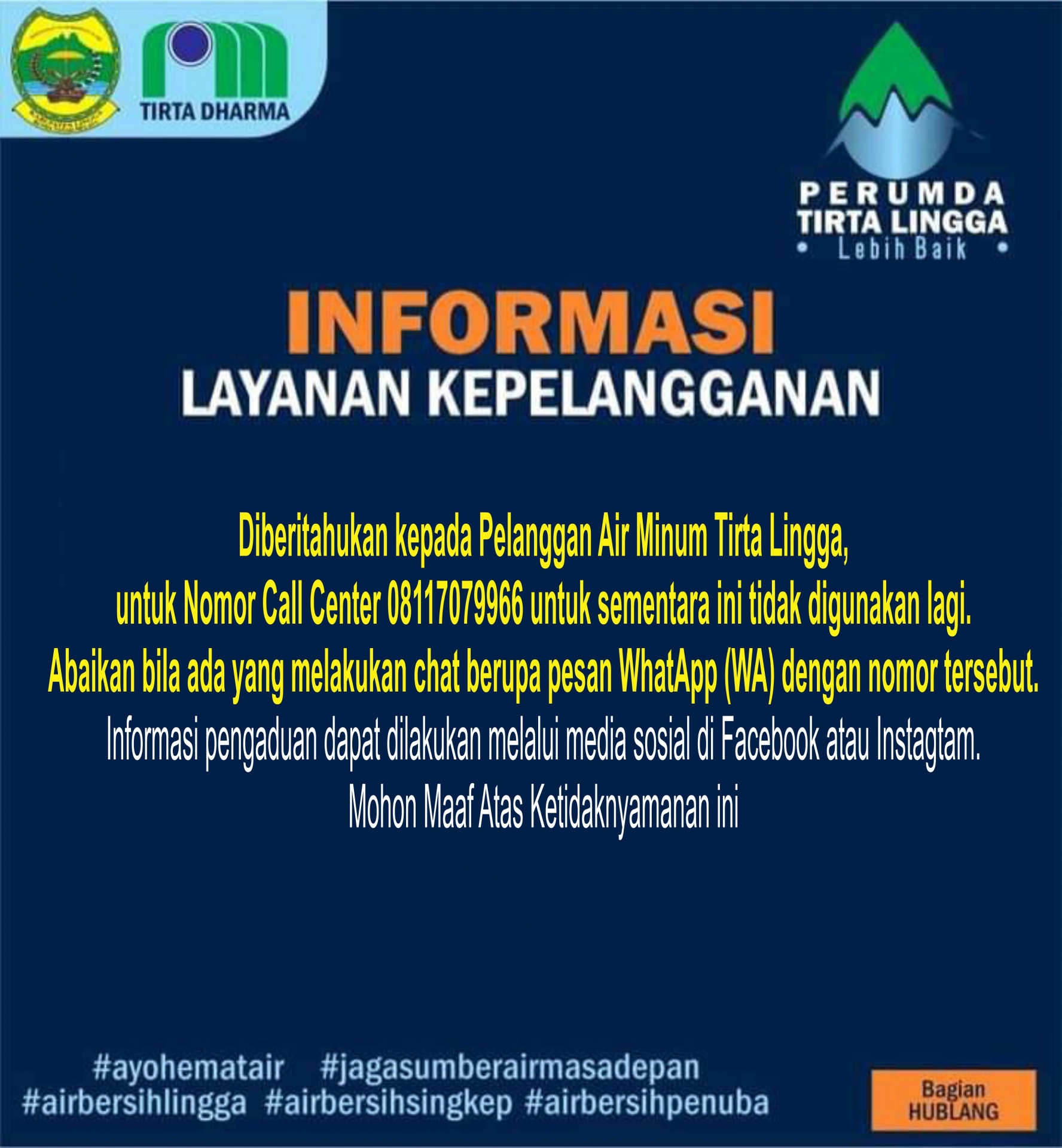 Diberitahukan kepada Pelanggan Air Minum Tirta Lingga,  untuk Nomor Call Center 08117079966 untuk sementara ini tidak digunakan lagi.   Abaikan bila ada yang melakukan chat berupa pesan WhatApp (WA) dengan nomor tersebut. Informasi pengaduan dapat dilakukan melalui media sosial di Faceboo