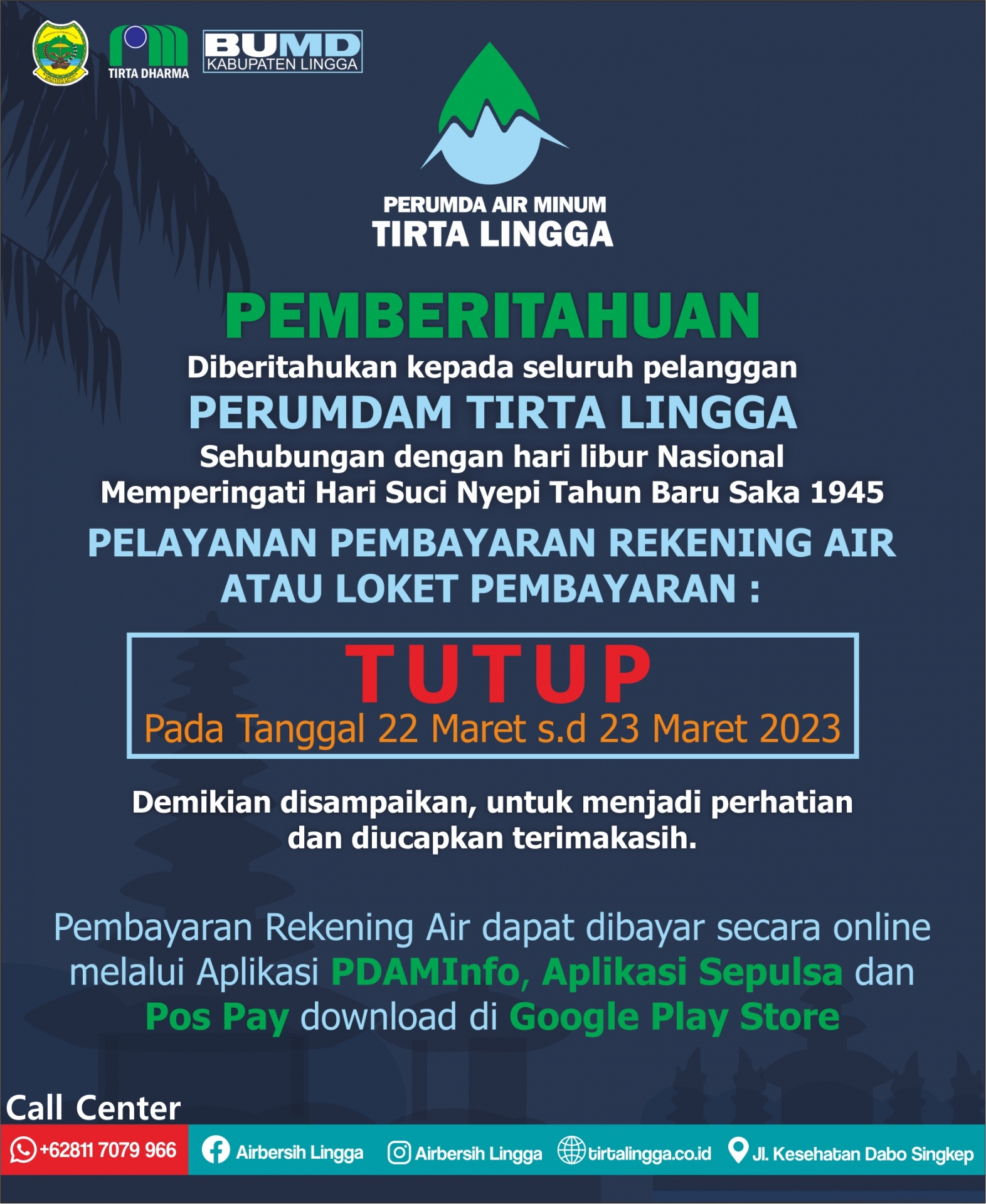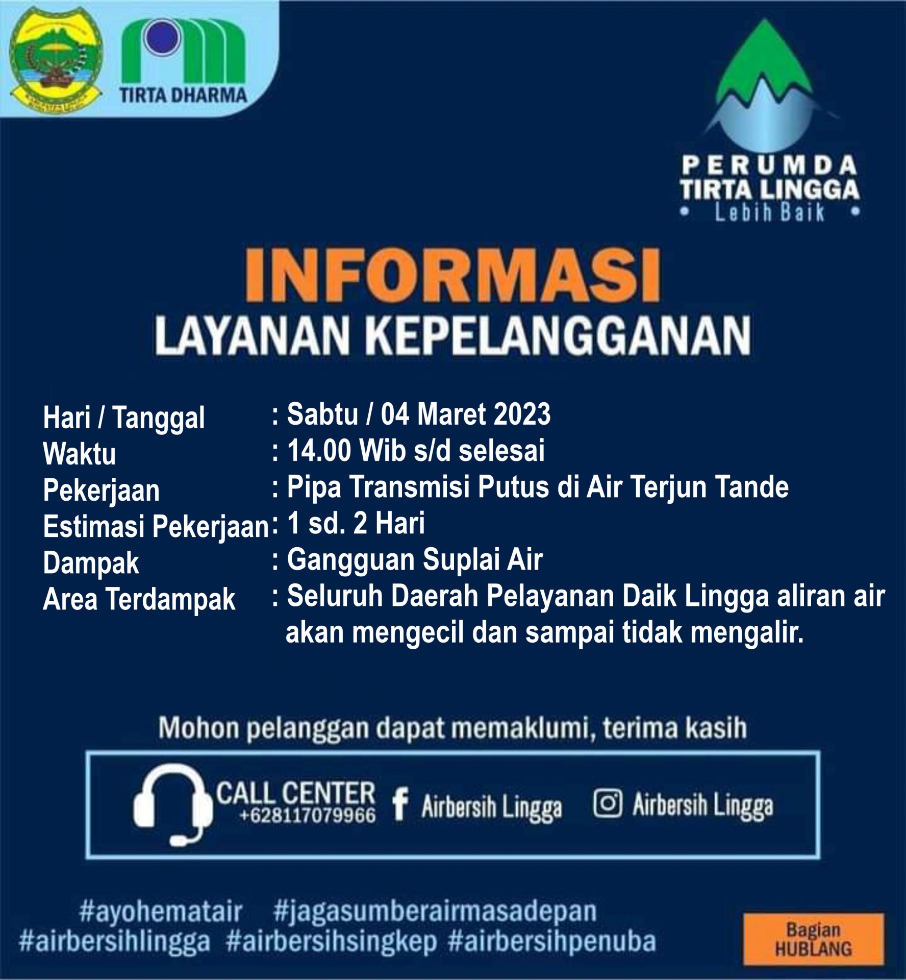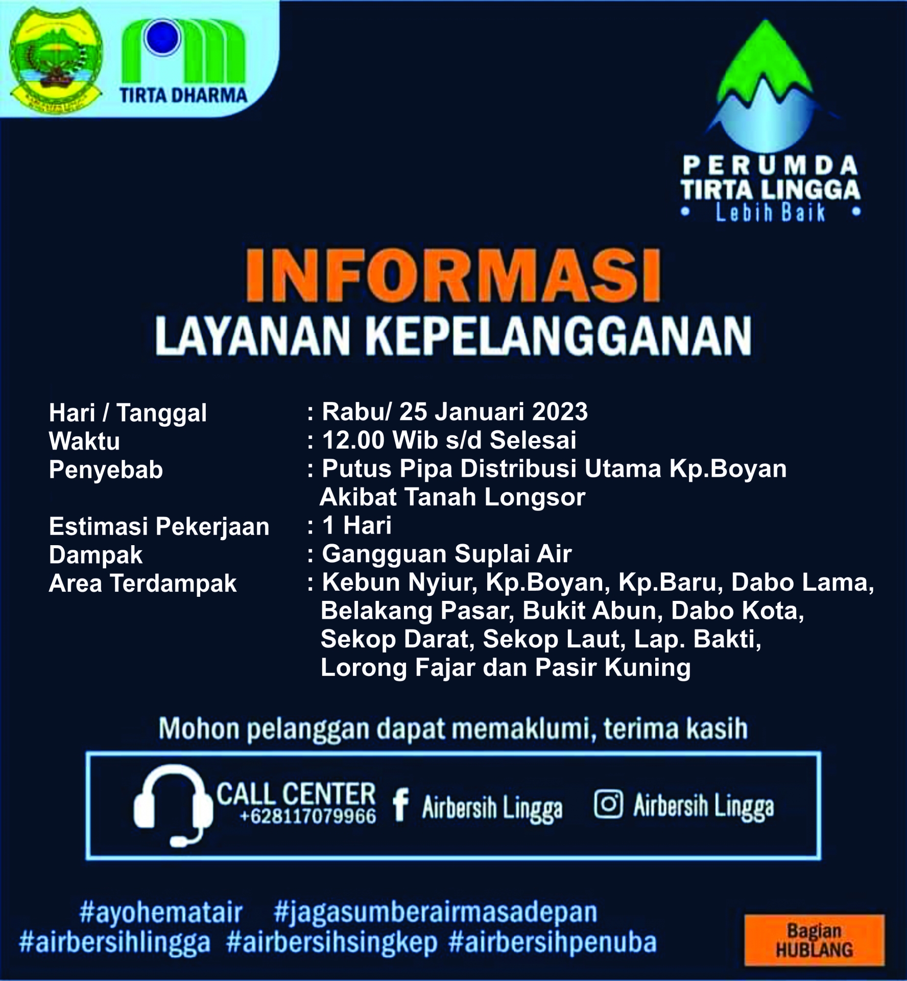 Diberitahukan kepada pelanggan Perumda Air Minum Tirta Lingga Pelayanan Dabo